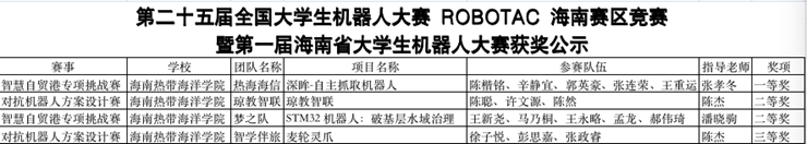 2025 年 12 月 14 日,第二十五届全国大学生机器人大赛海南赛区竞赛暨第一届海南省大学生机器人大赛在海南师范大学圆满落幕。我院学子组队参赛,凭借扎实的专业功底和创新的实践能力,一举斩获一等奖 1 项、二等奖 2 项、三等奖 1 项。